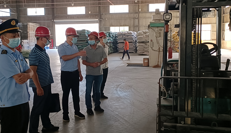 在东湖镇的福建新正阳饲料科技有限公司,检查组一行和公司负责人一起座谈,检查安全生产内页资料,详细了解企业安全生产情况,并深入车间重点检查是否规范化生产,排查密闭空间粉尘、易燃易爆原材料存在的风险隐患,发现安全隐患2个,1个当场整改,1个限期整改。