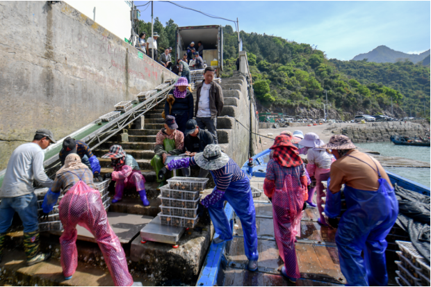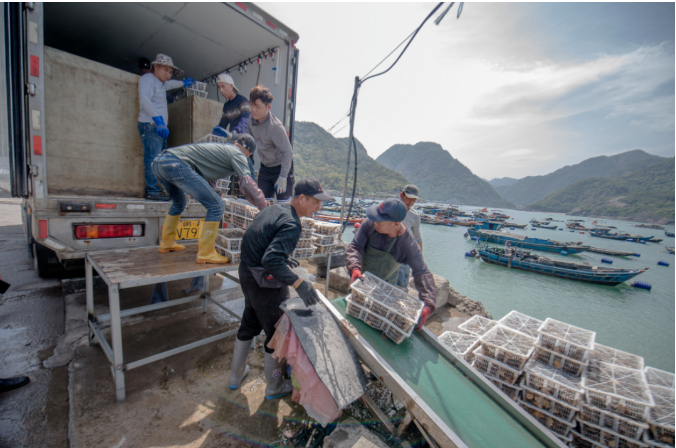 早年渔民需在渔排上手工称重,鲍鱼容易脱水。直到3年前,村里自筹资金建成全省首条渔排传送带,“海上电梯”改变了传统作业模式。“如今在采收旺季,高峰期每天过秤2万筐,总重超百吨。”码头负责人陈义忠说。