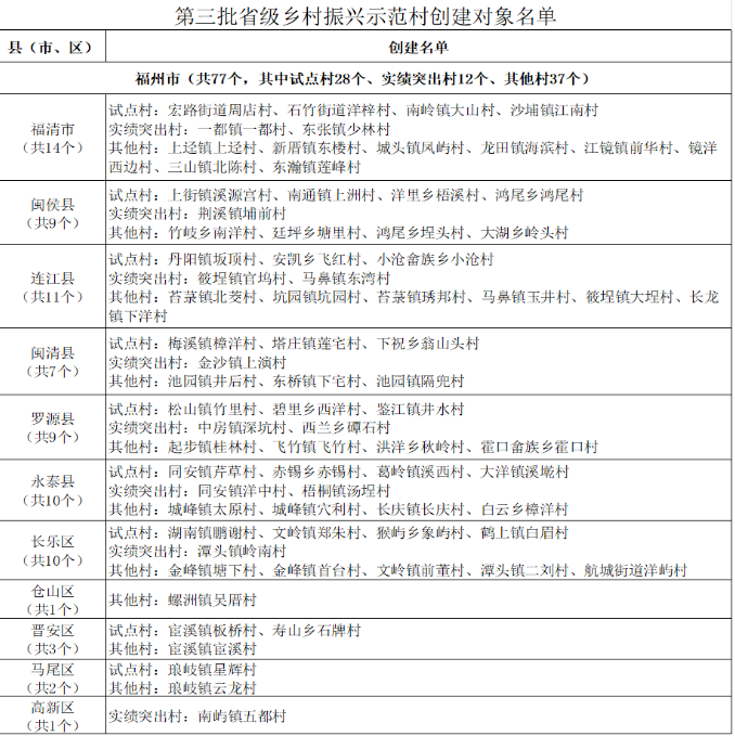 为贯彻农业农村部、国家乡村振兴局“百县千乡万村”乡村振兴示范创建要求,落实我省《关于开展“千村示范引领、万村共富共美”工程走具有福建特色乡村振兴之路的实施意见》,省农业农村厅、乡村振兴局组织开展第三批省级乡村振兴示范乡镇、示范村创建对象遴选工作。经县级申报、市级审核推荐、省级评审确定和公示,将福州市福清市海口镇等40个单位纳入第三批省级乡村振兴示范乡镇创建对象名单、福州市福清市宏路街道周店村等500个单位纳入第三批省级乡村振兴示范村创建对象名单,现予公布。