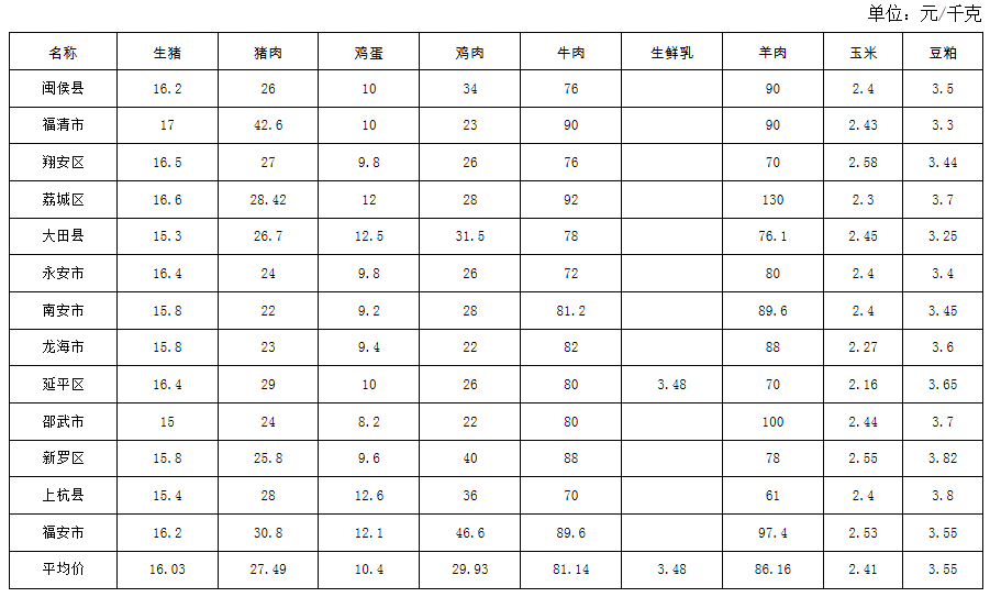 福建省2025年第8周畜产品及饲料集市价格周报
