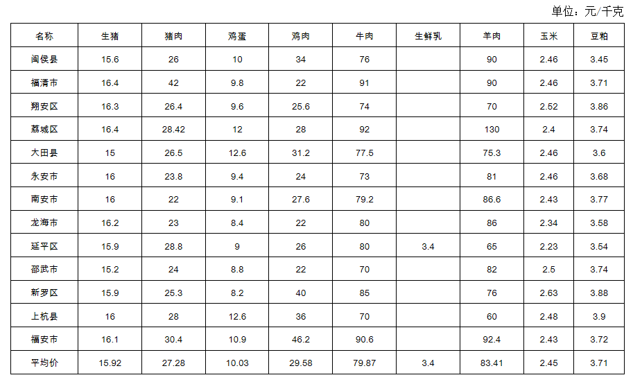 福建省2025年第11周畜产品及饲料集市价格周报