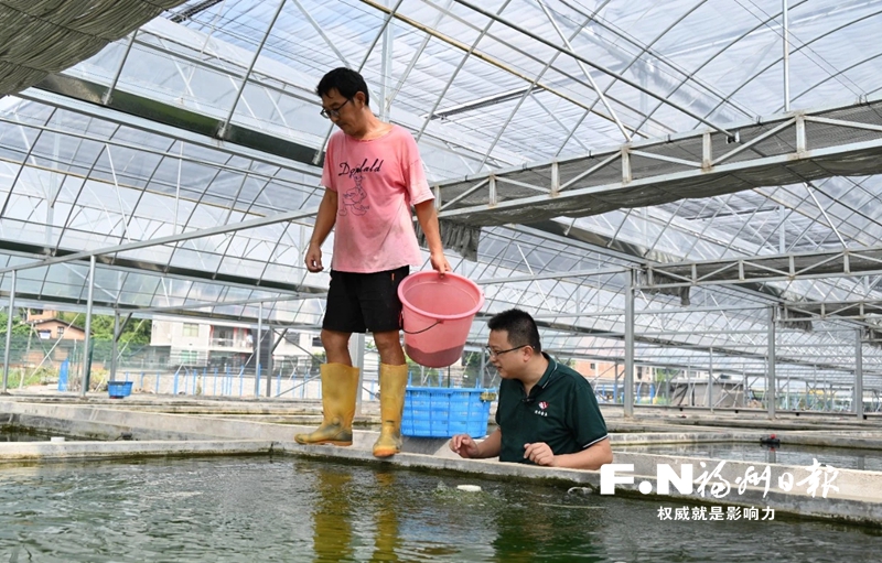 黄镇(右)指导养殖户科学养殖。潘慧晶 摄