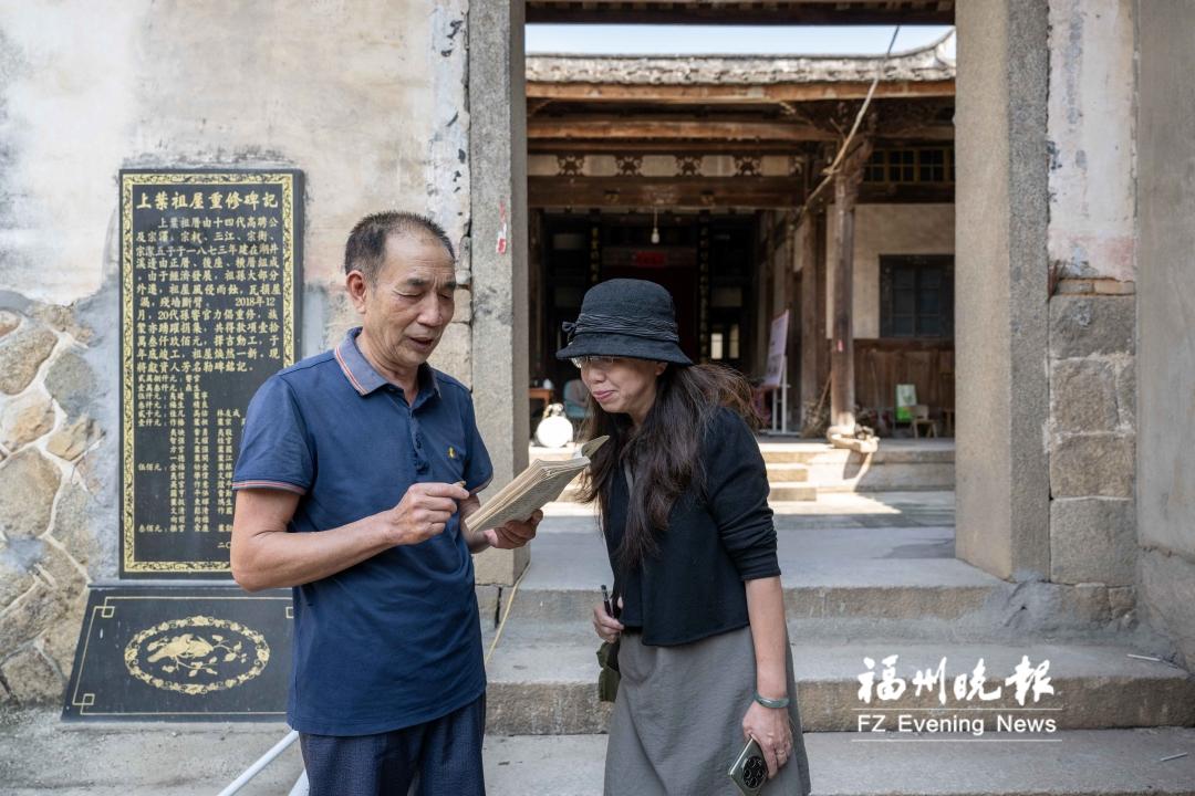 陈宁(左)向王佳凌介绍桂林村村史。