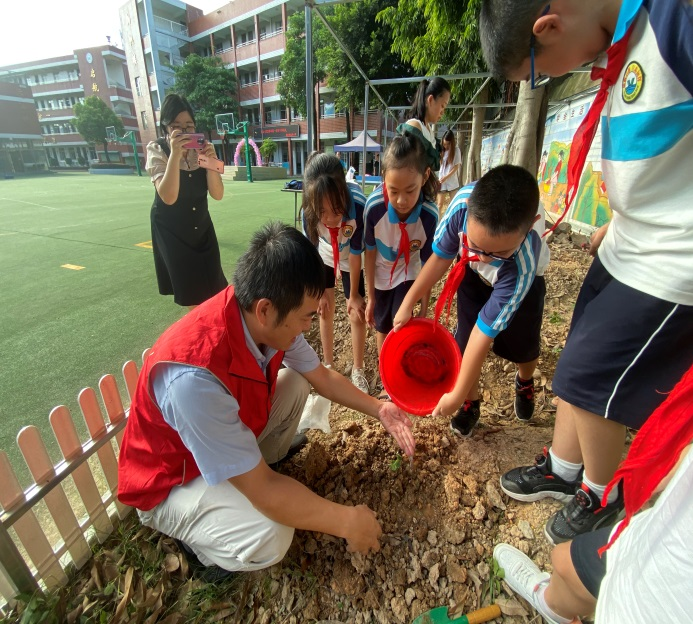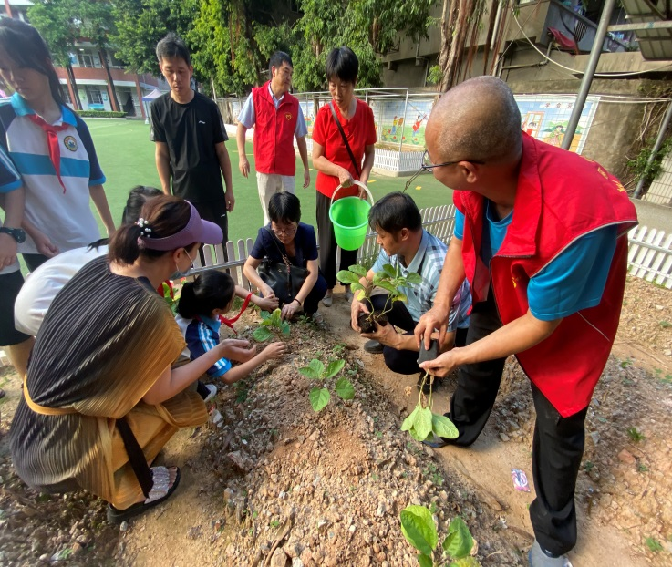 随后,刘黄洪校长带领大家来到操场边蔬菜劳动实践教育基地,同学们在科技志愿者的指导下用小铲子松土挖坑,将提我所品种丝瓜苗、瓠瓜苗、茄子苗小心翼翼地放入其中,随后覆盖上泥土、浇水,一步一步开启属于同学们自己的菜园子。田间实践让同学们体验了劳作的喜悦,在学到科学知识的同时也收获了种植的快乐。